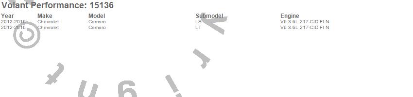 Below is an abbreviated list of applications for the Cold Air Intake Kit.Camaro, Chevrolet, 2015, 2014, 2013, 2012