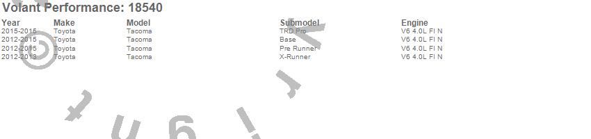 Below is an abbreviated list of applications for the Cold Air Intake Kit.Tacoma, Toyota, 2015, 2014, 2013, 2012