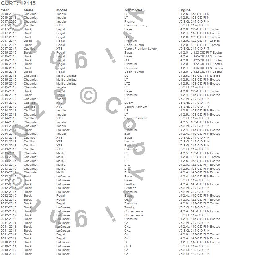 Below is an abbreviated list of applications for the Class II 1.25 in. Receiver Hitch.Impala, LaCrosse, Malibu, Malibu Limited, Regal, XTS, Buick, Cadillac, Chevrolet, 2020, 2019, 2018, 2017, 2016, 2015, 2014, 2013, 2012, 2011, 2010