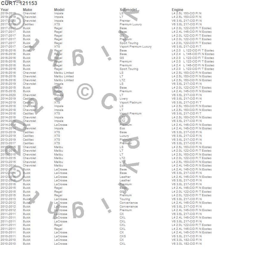 Below is an abbreviated list of applications for the Class II 1.25 in. Receiver Hitch.Impala, LaCrosse, Malibu, Malibu Limited, Regal, XTS, Buick, Cadillac, Chevrolet, 2020, 2019, 2018, 2017, 2016, 2015, 2014, 2013, 2012, 2011, 2010