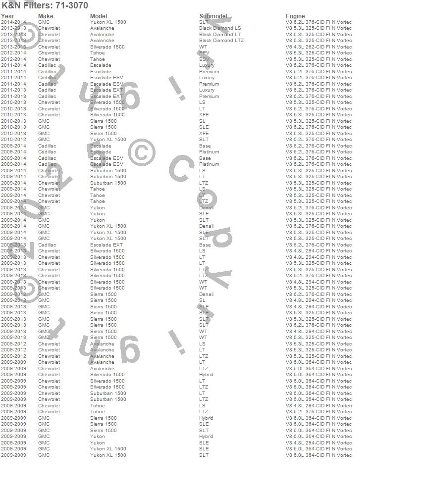Below is an abbreviated list of applications for the Blackhawk Air Induction Kit.Avalanche, Escalade, Escalade ESV, Escalade EXT, Sierra 1500, Silverado 1500, Suburban 1500, Tahoe, Yukon, Yukon XL 1500, Cadillac, Chevrolet, GMC, 2014, 2013, 2012, 2011, 2010, 2009