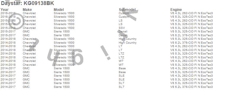 Below is an abbreviated list of applications for the Suspension Strut Spacer Leveling Kit.Sierra 1500, Silverado 1500, Chevrolet, GMC, 2018, 2017, 2016, 2015, 2014