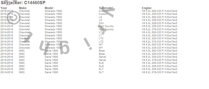 Brand: SkyjackerPart Number: C14460SPLift Kit-Suspension Component Type: 4 in. LiftUPC: 803696217550
