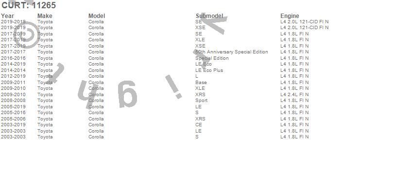 Below is an abbreviated list of applications for the Class I 1.25 in. Receiver Hitch.Corolla, Toyota, 2019, 2018, 2017, 2016, 2015, 2014, 2013, 2012, 2011, 2010, 2009, 2008, 2007, 2006, 2005, 2004, 2003