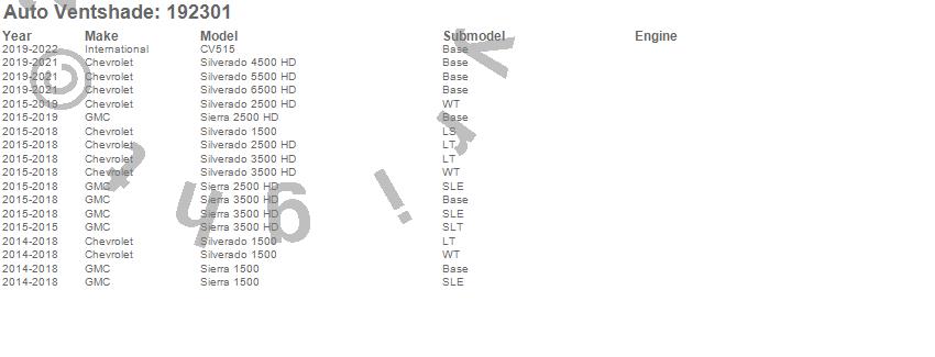 Below is an abbreviated list of applications for the Ventvisor In-Channel Deflector 2 pc..CV515, Sierra 1500, Sierra 2500 HD, Sierra 3500 HD, Silverado 1500, Silverado 2500 HD, Silverado 3500 HD, Silverado 4500 HD, Silverado 5500 HD, Silverado 6500 HD, Chevrolet, GMC, International, 2024, 2023, 2022, 2021, 2020, 2019, 2018