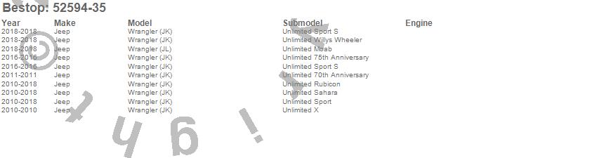 Below is an abbreviated list of applications for the Header Extended Safari Cable Style Bikini Top.Wrangler (JK), Wrangler (JL), Jeep, 2018, 2017, 2016, 2015, 2014, 2013, 2012, 2011, 2010