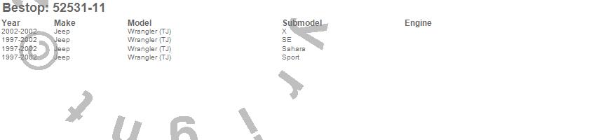 Brand: BestopPart Number: 52531-11Brief Soft Top Type: Mesh - Color-Matched - No Drill Header - Requires Installation Of PN[51238]UPC: 077848020958