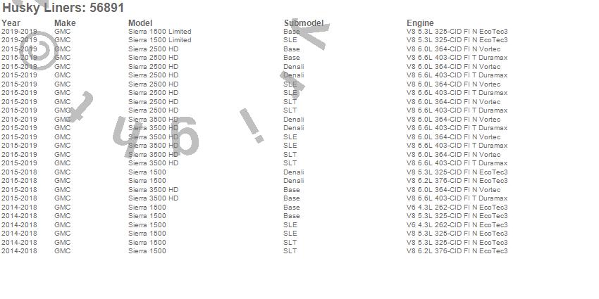 Below is an abbreviated list of applications for the Custom Molded Mud Guards.Sierra 1500, Sierra 1500 Limited, Sierra 2500 HD, Sierra 3500 HD, GMC, 2019, 2018, 2017, 2016, 2015, 2014