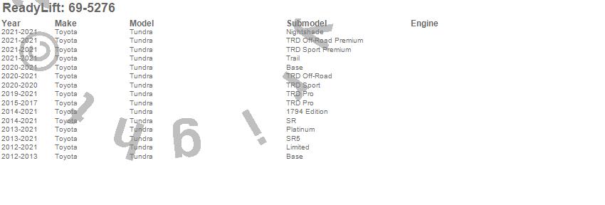 Below is an abbreviated list of applications for the SST Lift Kit.Tundra, Toyota, 2021, 2020, 2019, 2018, 2017, 2016, 2015, 2014, 2013, 2012