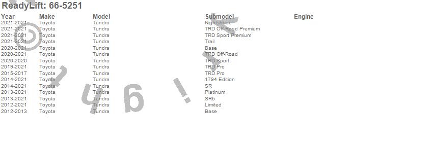 Below is an abbreviated list of applications for the Front Leveling Kit.Tundra, Toyota, 2021, 2020, 2019, 2018, 2017, 2016, 2015, 2014, 2013, 2012