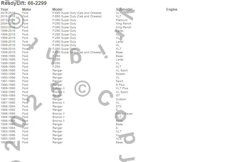 Below is an abbreviated list of applications for the Front Leveling Kit.Bronco II, F-250, F-250 Super Duty, F-350 Super Duty, F-550 Super Duty, Ranger, Ford, 2016, 2015, 2014, 2013, 2012, 2011, 2010, 2009, 2008, 2007, 2006, 2005, 2004