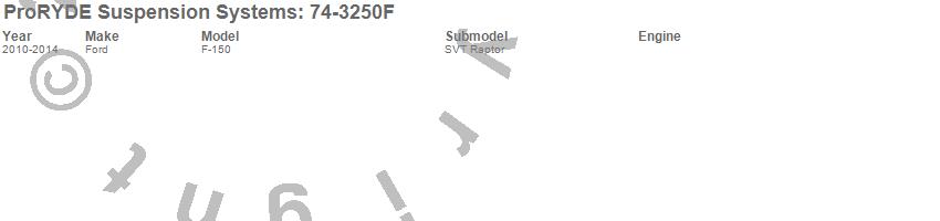 Brand: ProRYDE Suspension SystemsPart Number: 74-3250FSuspension Front Leveling Kit Type: Front - Adjustable - 1.5-2.25 in. Lift - 2.1 Hours Install Time - On Vehicle AdjustmentUPC: 029476743259