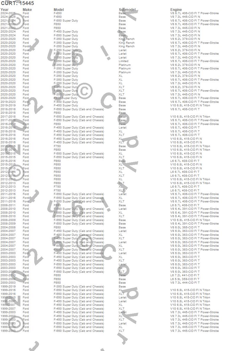 Below is an abbreviated list of applications for the Class V 2 in. Xtra Duty Hitch.F-350 Super Duty, F-450 Super Duty, F-550 Super Duty, F-650, F450 Super Duty, F650, F750, Ford, 2026, 2025, 2024, 2023, 2022, 2021, 2020, 2019, 2018, 2017, 2016, 2015