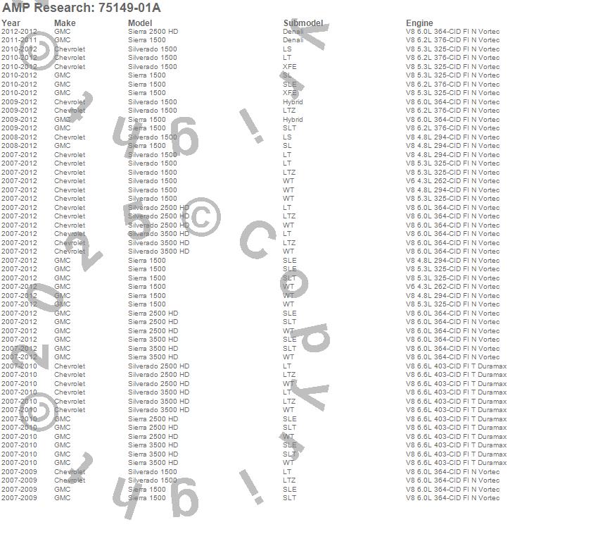 Below is an abbreviated list of applications for the PowerStep Trim Strip Kit.Sierra 1500, Sierra 2500 HD, Sierra 3500 HD, Silverado 1500, Silverado 2500 HD, Silverado 3500 HD, Chevrolet, GMC, 2012, 2011, 2010, 2009, 2008, 2007