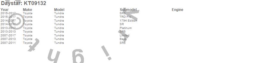 Below is an abbreviated list of applications for the Suspension System Spacer Kit.Tundra, Toyota, 2017, 2016, 2015, 2014, 2013, 2012, 2011, 2010, 2009, 2008, 2007