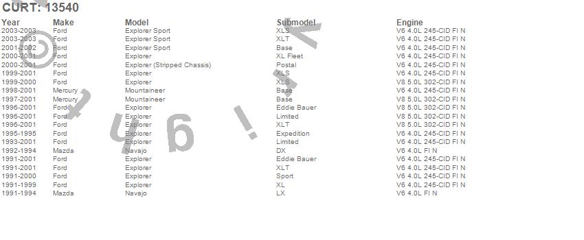 Below is an abbreviated list of applications for the Class III 2 in. Receiver Hitch.Explorer, Explorer (Stripped Chassis), Explorer Sport, Mountaineer, Navajo, Ford, Mazda, Mercury, 2003, 2002, 2001, 2000, 1999, 1998, 1997, 1996, 1995, 1994, 1993, 1992