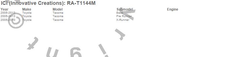 Brand: ICI (Innovative Creations)Part Number: RA-T1144MRocker Panel Guard Type: 6 in. Width - 12 pc.UPC: 845426022065