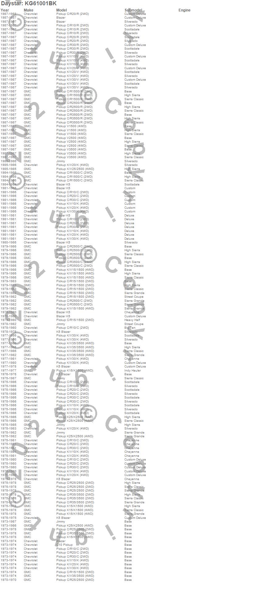 Below is an abbreviated list of applications for the Super Shackle/Greasable.Blazer, Blazer K5, C10 Pickup, C1500 Pickup, C20 Pickup, C25/C2500 Pickup, C2500 Pickup, C30 Pickup, C35/C3500 Pickup, C3500 Pickup, Jimmy, K10 Pickup, K1500 Pickup, K20 Pickup, K25 Pickup, K25/K2500 Pickup, K2500 Pickup, K30 Pickup, K35 Pickup, K35/K3500 Pickup