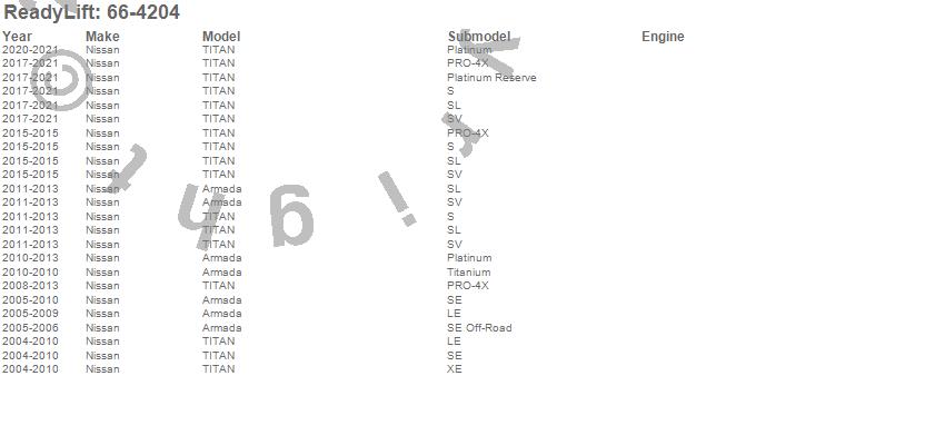 Below is an abbreviated list of applications for the Front Leveling Kit.Armada, TITAN, Nissan, 2021, 2020, 2019, 2018, 2017, 2015, 2013, 2012, 2011, 2010, 2009, 2008, 2007, 2006, 2005, 2004