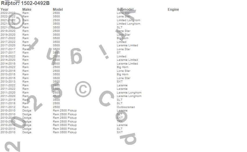 Brand: RaptorPart Number: 1502-0492BNerf/Step Bar Type: Black E-Coated - 4 in. - Cab Length - Cab MountUPC: 816164017705
