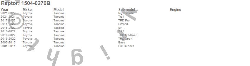 Brand: RaptorPart Number: 1504-0270BNerf/Step Bar Type: Black E-Coated - 4 in. - Cab Length - Rocker Panel MountUPC: 816164017866