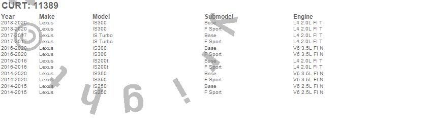 Below is an abbreviated list of applications for the Class I 1.25 in. Receiver Hitch.IS Turbo, IS200t, IS250, IS300, IS350, Lexus, 2020, 2019, 2018, 2017, 2016, 2015, 2014