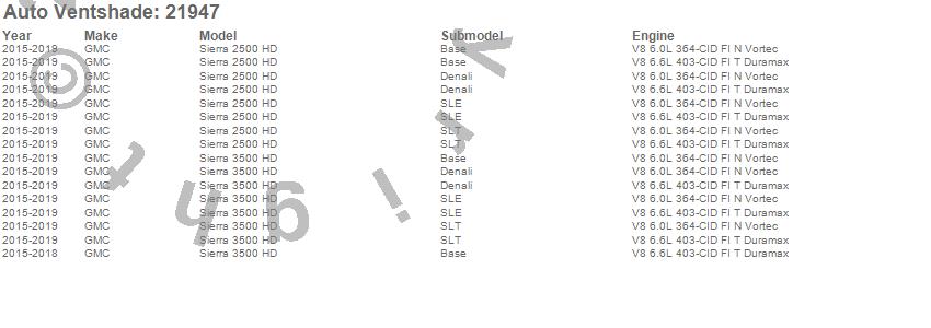 Below is an abbreviated list of applications for the Hoodflector Hood Protector.Sierra 2500 HD, Sierra 3500 HD, GMC, 2019, 2018, 2017, 2016, 2015