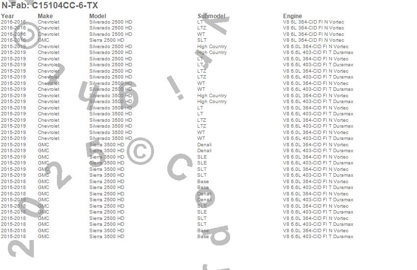 Below is an abbreviated list of applications for the Wheel To Wheel Nerf Step Bar w/Bed Access.Sierra 2500 HD, Sierra 3500 HD, Silverado 2500 HD, Silverado 3500 HD, Chevrolet, GMC, 2019, 2018, 2017, 2016, 2015
