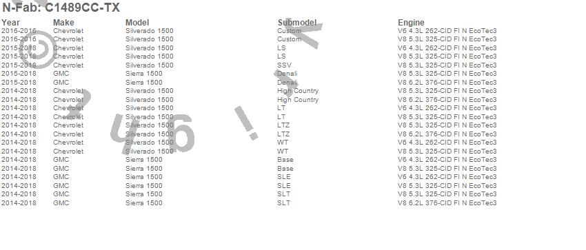 Below is an abbreviated list of applications for the Wheel To Wheel Nerf Step Bar.Sierra 1500, Silverado 1500, Chevrolet, GMC, 2018, 2017, 2016, 2015, 2014