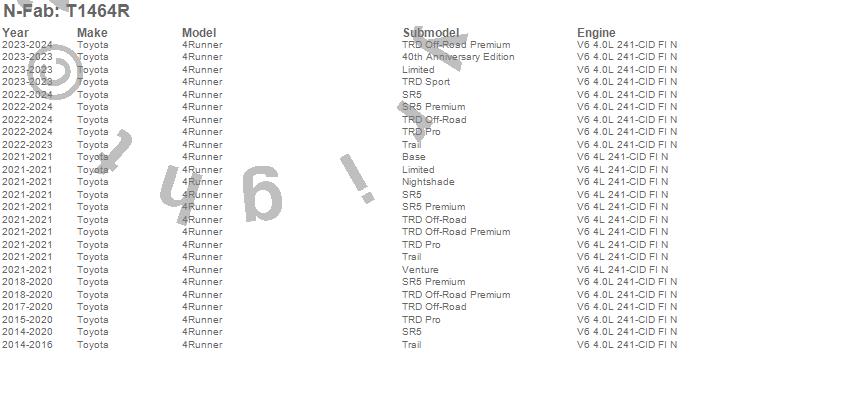 Below is an abbreviated list of applications for the Wheel To Wheel Nerf Step Bar.4Runner, Toyota, 2024, 2023, 2022, 2021, 2020, 2019, 2018, 2017, 2016, 2015, 2014