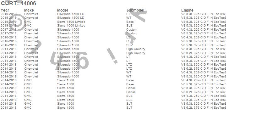 Below is an abbreviated list of applications for the Class IV 2 in. Receiver Hitch.Sierra 1500, Sierra 1500 Limited, Silverado 1500, Silverado 1500 LD, Chevrolet, GMC, 2019, 2018, 2017, 2016, 2015, 2014