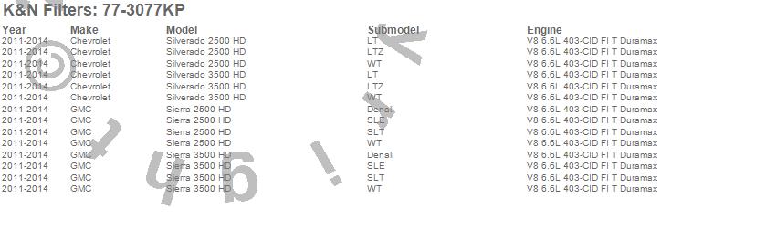 Below is an abbreviated list of applications for the Performance Induction Kit.Sierra 2500 HD, Sierra 3500 HD, Silverado 2500 HD, Silverado 3500 HD, Chevrolet, GMC, 2014, 2013, 2012, 2011