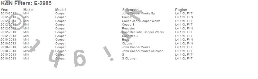 Below is an abbreviated list of applications for the Air Filter.Cooper, Mini, 2013, 2012, 2011, 2010