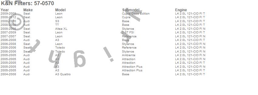 Below is an abbreviated list of applications for the 57i Series Induction Kit.A3, A3 Quattro, Altea XL, Leon, S3, Toledo, TT, Audi, Seat, 2012, 2011, 2010, 2009, 2008, 2007, 2006, 2005, 2004