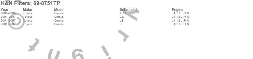 Below is an abbreviated list of applications for the Typhoon Cold Air Induction Kit.Corolla, Toyota, 2007, 2006, 2005, 2004, 2003, 2002, 2001