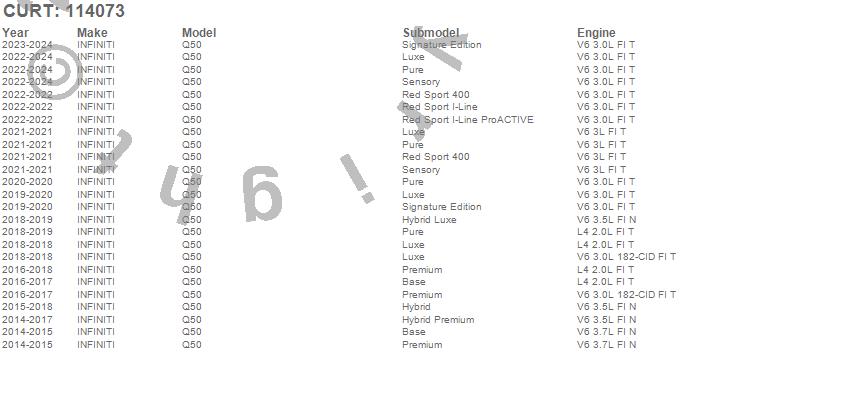 Below is an abbreviated list of applications for the Class I 1.25 in. Receiver Hitch.Q50, INFINITI, 2024, 2023, 2022, 2021, 2020, 2019, 2018, 2017, 2016, 2015, 2014