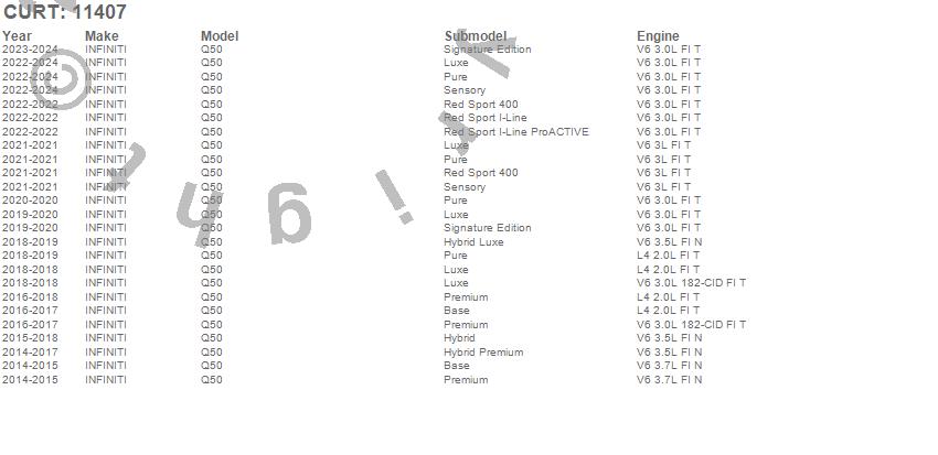 Below is an abbreviated list of applications for the Class I 1.25 in. Receiver Hitch.Q50, INFINITI, 2024, 2023, 2022, 2021, 2020, 2019, 2018, 2017, 2016, 2015, 2014
