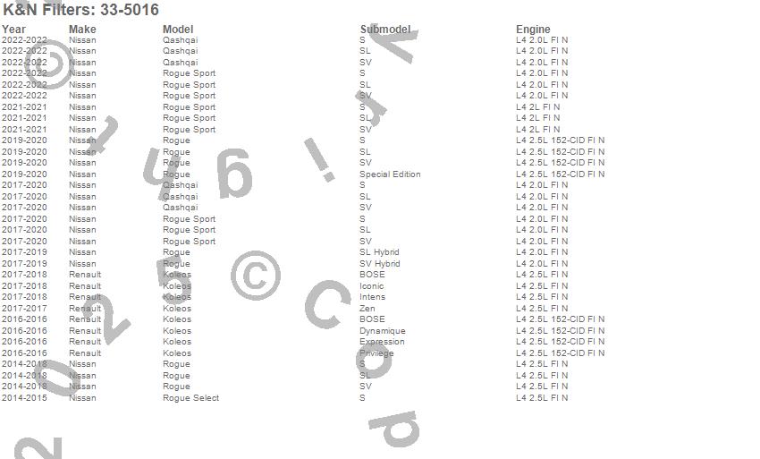 Below is an abbreviated list of applications for the Air Filter.Koleos, Qashqai, Rogue, Rogue Select, Rogue Sport, Nissan, Renault, 2019, 2018, 2017, 2016, 2015, 2014
