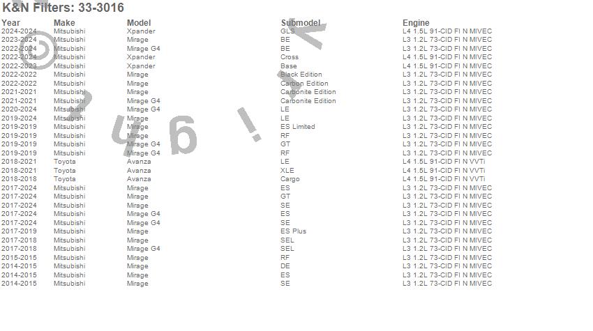 Below is an abbreviated list of applications for the Air Filter.Avanza, Mirage, Mirage G4, Mitsubishi, Toyota, 2018, 2017, 2015, 2014