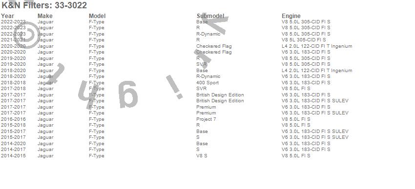 Below is an abbreviated list of applications for the Air Filter.F-Type, Jaguar, 2019, 2018, 2017, 2016, 2015, 2014
