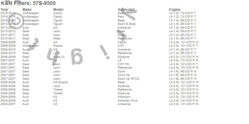 Below is an abbreviated list of applications for the 57i Series Induction Kit.A3, A3 Quattro, Altea, Altea XL, Caddy, Leon, Passat, Tiguan, Toledo, Audi, Seat, Volkswagen, 2015, 2014, 2013, 2012, 2011, 2010, 2009, 2008
