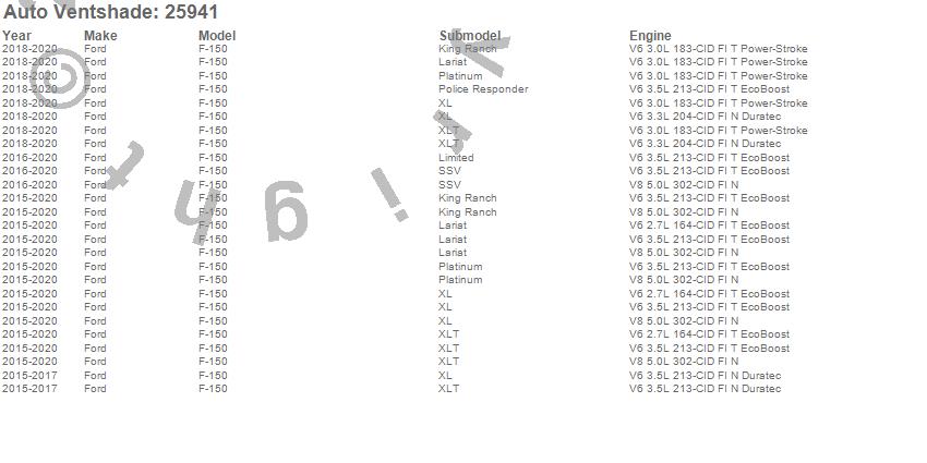 Below is an abbreviated list of applications for the Bugflector II Stone/Bug Deflector.F-150, Ford, 2020, 2019, 2018, 2017, 2016, 2015