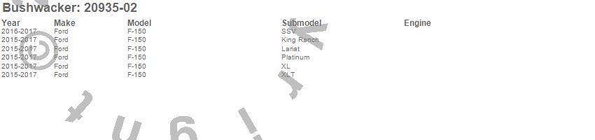 Brand: BushwackerPart Number: 20935-02Fender Flare Type: 4 pc. - Front Tire Coverage 1.5 in. - Front Height 6.13 in. - Rear Tire Coverage 1.5 in - Rear Height 7 in. - Smooth Finish - BlackUPC: 090689118080