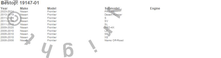Brand: BestopPart Number: 19147-01Tonneau Cover Type: BlackUPC: 077848129088