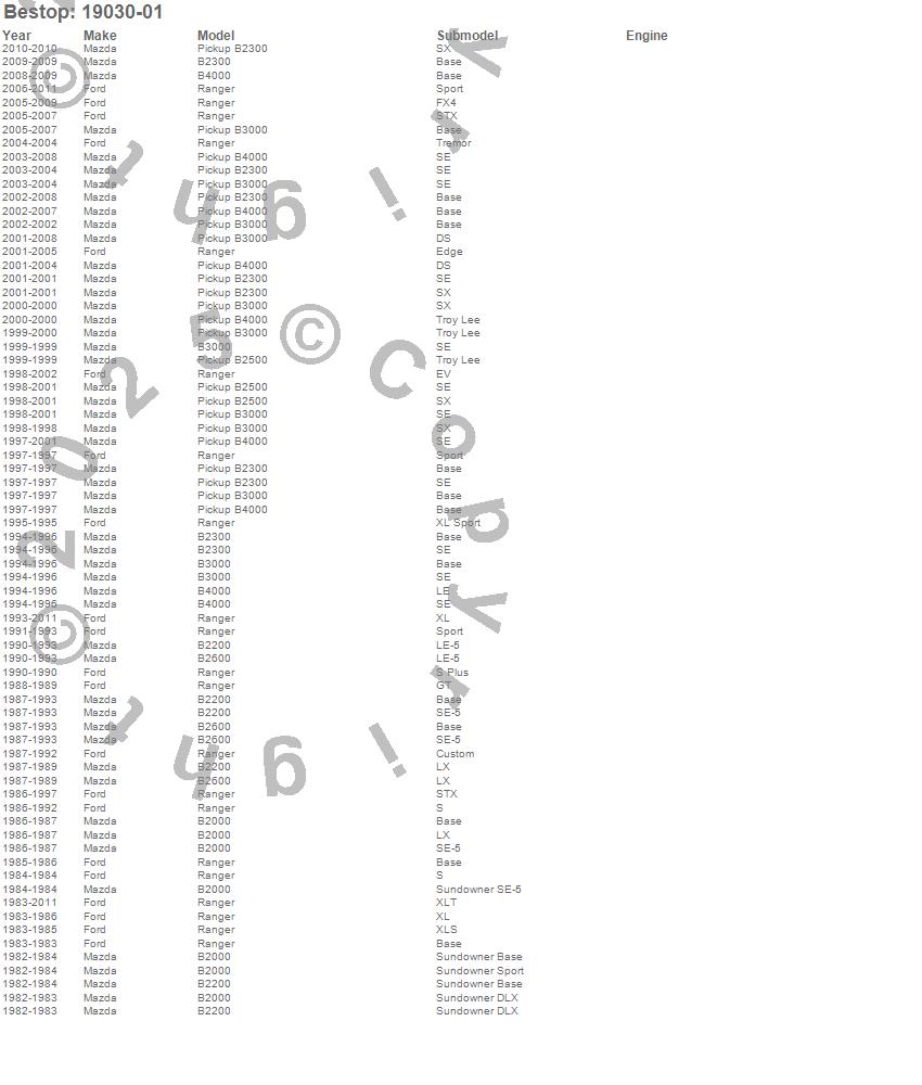 Below is an abbreviated list of applications for the EZ Roll Soft Tonneau Cover.B2000, B2200, B2300, B2500, B2600, B3000, B4000, Ranger, Ford, Mazda, 2011, 2010, 2009, 2008, 2007, 2006, 2005, 2004, 2003, 2002