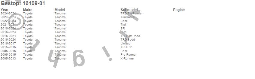 Below is an abbreviated list of applications for the EZ Fold Soft Tri-Fold Tonneau Cover.Tacoma, Toyota, 2024, 2023, 2022, 2021, 2020, 2019, 2018, 2017, 2016, 2015, 2014, 2013, 2012, 2011, 2010, 2009, 2008, 2007