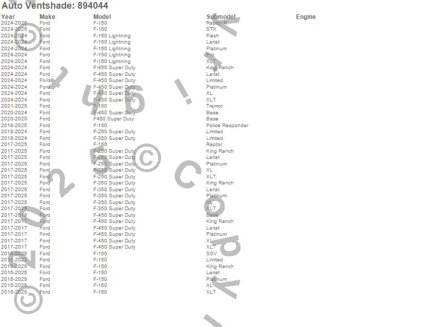 Below is an abbreviated list of applications for the Ventvisor Low Profile Deflector 4 pc..F-150, F-150 Lightning, F-250 Super Duty, F-350 Super Duty, F-450 Super Duty, F450 Super Duty, Ford, 2026, 2025, 2024, 2023, 2022, 2021, 2020, 2019, 2018, 2017, 2016, 2015