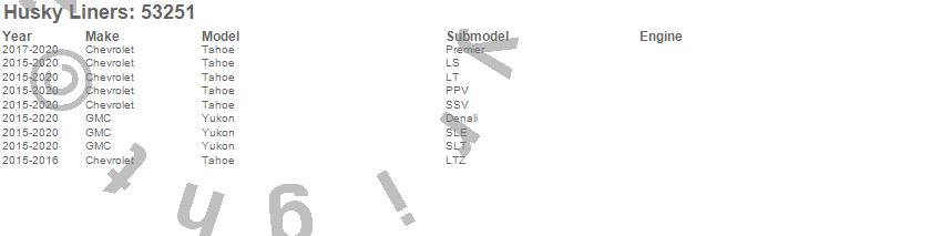 Below is an abbreviated list of applications for the X-act Contour Floor Liner.Tahoe, Yukon, Chevrolet, GMC, 2020, 2019, 2018, 2017, 2016, 2015