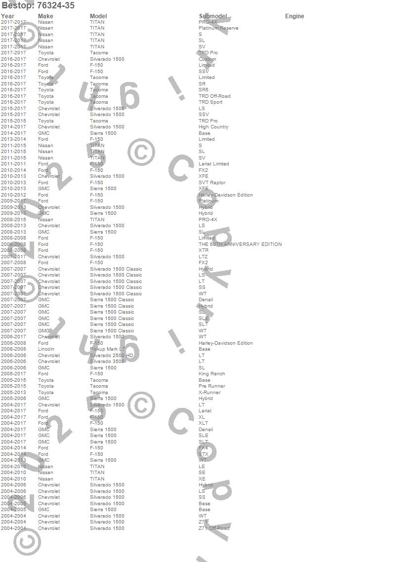 Below is an abbreviated list of applications for the Window Replacement Set.F-150, Mark LT, Sierra 1500, Sierra 1500 Classic, Silverado 1500, Silverado 1500 Classic, Silverado 2500 HD, Silverado 3500, Tacoma, TITAN, Chevrolet, Ford, GMC, Lincoln, Nissan, Toyota, 2017, 2016, 2015, 2014