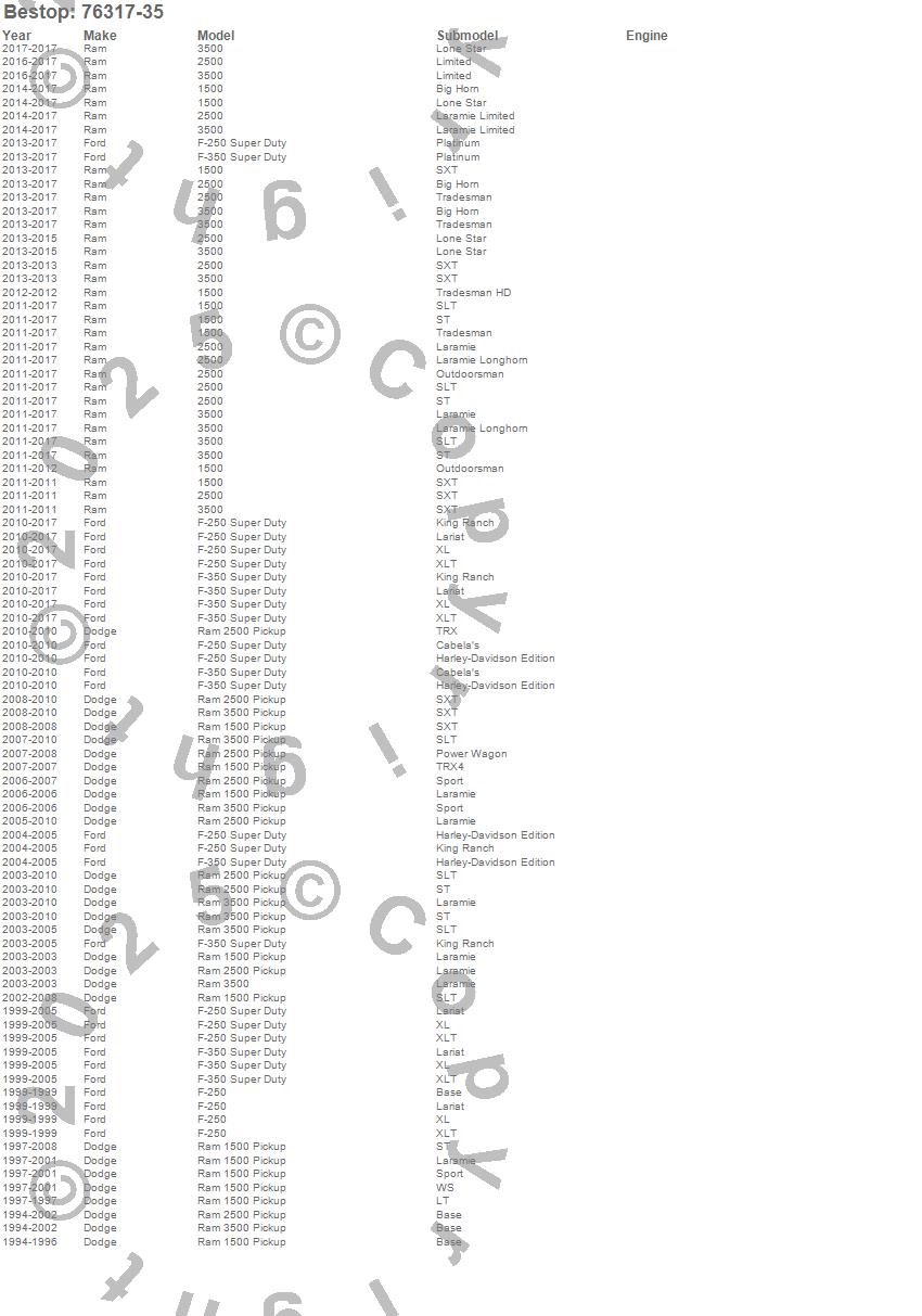 Below is an abbreviated list of applications for the Supertop Truck Bed Top.1500, 2500, 3500, F-250, F-250 Super Duty, F-350 Super Duty, Ram 1500, Ram 2500, Ram 3500, Dodge, Ford, Ram, 2017, 2016, 2015, 2014, 2013, 2012, 2011, 2010